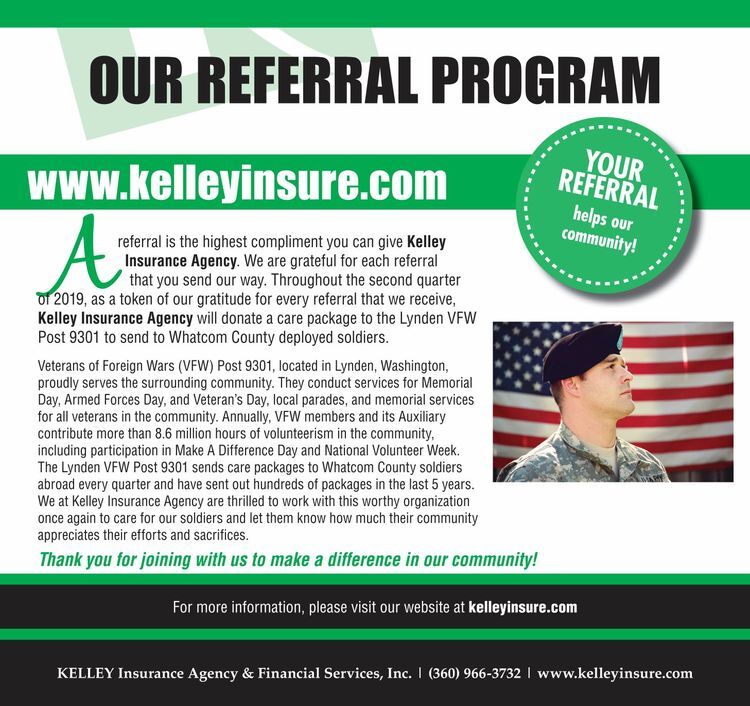For each referral you send our way, we are sending care packages to deployed Whatcom County soldiers through the Lynden VFW!